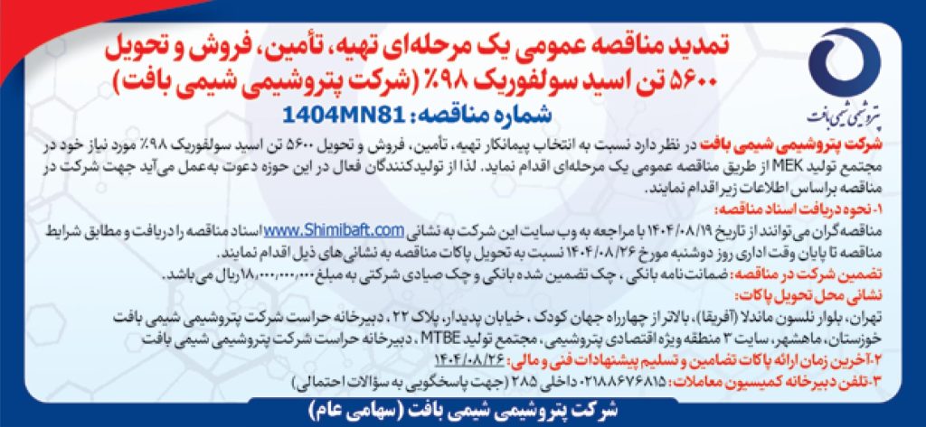 تمدید مناقصه عمومی یک مرحله ای تهیه، تأمین ، فروش و تحویل 5600 تن اسید سولفوریک 98%