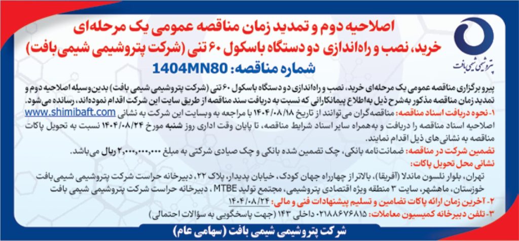 اصلاحیه دوم و تمدید زمان مناقصه عمومی یک مرحله ای خرید، نصب و راه اندازی دو دستگاه باسکول 60 تنی