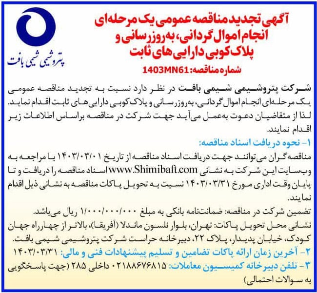 شرکت پتروشیمی شیمی بافت در نظر دارد نسبت به تجدید مناقصه عمومی یک مرحله ای انجام اموال گردانی ، به روز رسانی و پلاک کوبی دارایی های ثابت اقدام نماید. لذا از متقاضیان دعوت بعمل می آيد جهت شرکت در مناقصه مطابق شرايط زير اقدام نمايند.