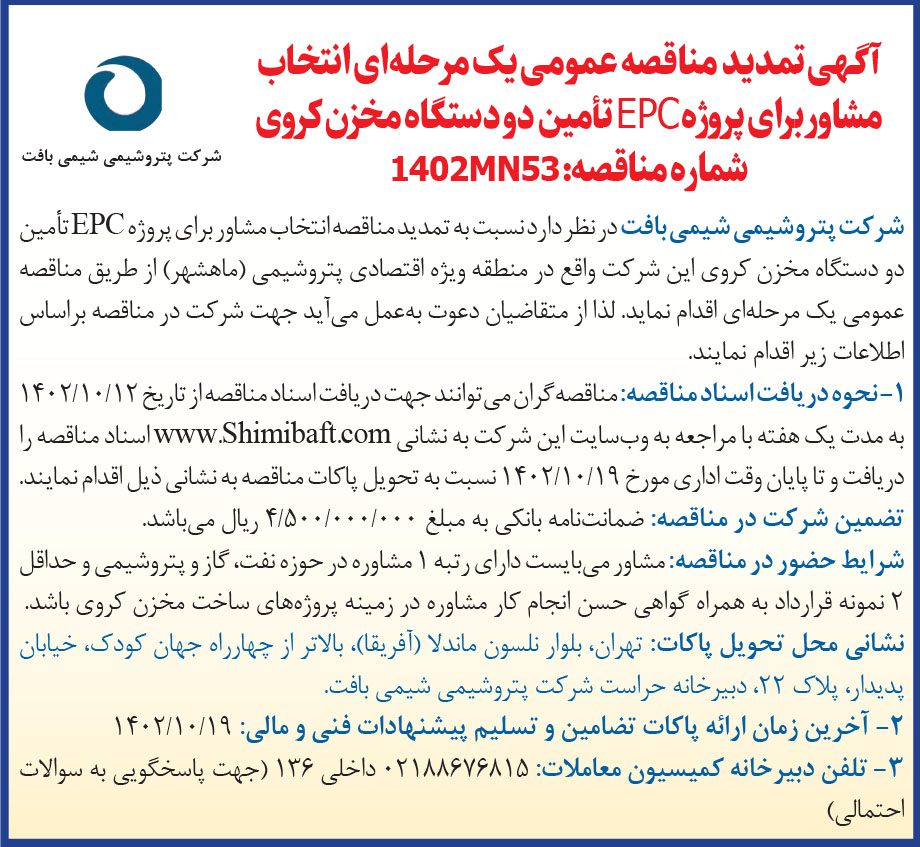 شرکت پتروشیمی شیمی بافت در نظر دارد نسبت به تمدید آگهی مناقصه انتخاب مشاور برای پروژه EPC تأمین دو دستگاه مخزن کروی این شرکت واقع در منطقه ویژه اقتصادی پتروشیمی (ماهشهر) از طریق مناقصه عمومی اقدام نماید. لذا از متقاضیان دعوت بعمل می آيد جهت شرکت در مناقصه مطابق شرايط زير اقدام نمايند.