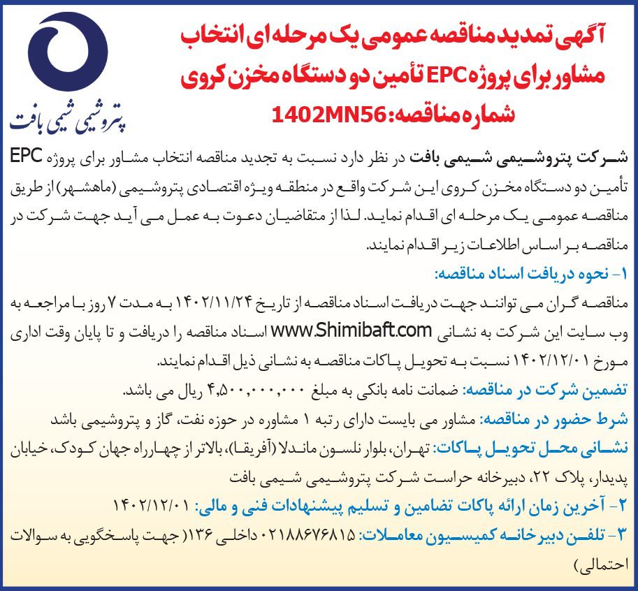 شرکت پتروشیمی شیمی بافت در نظر دارد نسبت به انتخاب مشاور برای پروژه EPC تأمین دو دستگاه مخزن کروی این شرکت واقع در منطقه ویژه اقتصادی پتروشیمی (ماهشهر) از طریق مناقصه عمومی اقدام نماید. لذا از متقاضیان دعوت بعمل می آيد جهت شرکت در مناقصه مطابق شرايط زير اقدام نمايند.