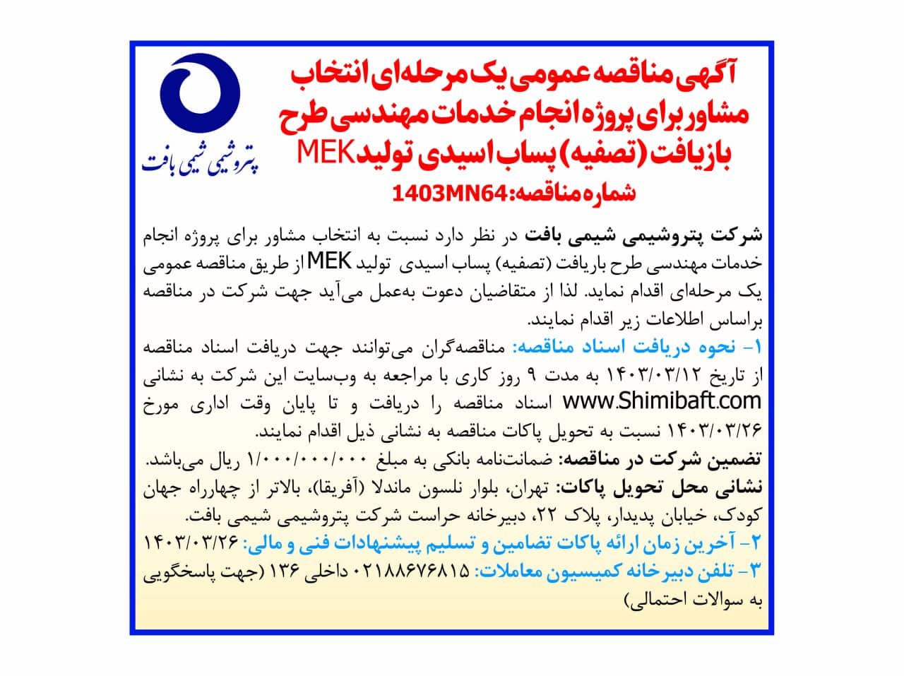 شرکت پتروشیمی شیمی بافت در نظر دارد نسبت به انتخاب مشاور برای پروژه انجام خدمات مهندسی طرح بازیافت (تصفیه) پساب اسیدی تولید MEK از طریق مناقصه عمومی یک مرحله ای اقدام نمايد. لذا از متقاضیان دعوت بعمل می آيد جهت شرکت در مناقصه مطابق شرايط زير اقدام نمايند.
