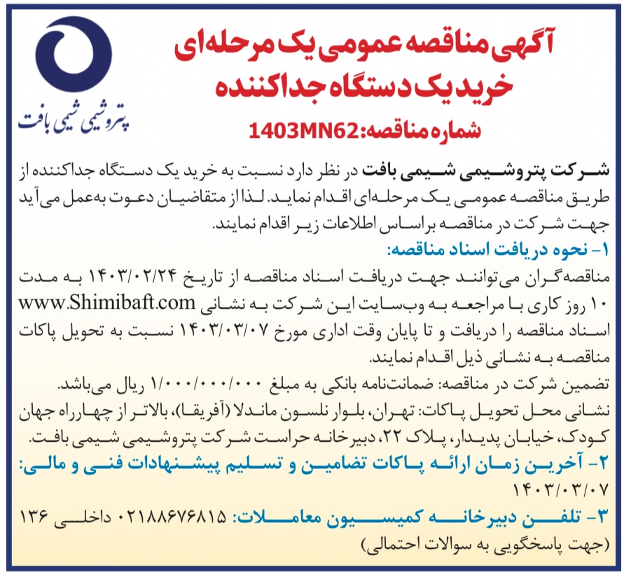 پتروشیمی شیمی بافت شرکت پتروشیمی شیمی بافت در نظر دارد نسبت به خرید یک دستگاه جداکننده از طریق مناقصه عمومی یک مرحله ای اقدام نماید. لذا از متقاضیان دعوت به عمل می آید جهت شرکت در مناقصه بر اساس اطلاعات زیر اقدام نمایند.