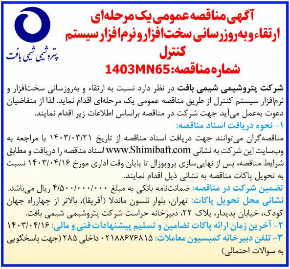 شرکت پتروشیمی شیمی بافت در نظر دارد نسبت به ارتقاء و بروزرسانی سخت افزار و نرم افزار سیستم کنترل از طریق مناقصه عمومی یک مرحله ای اقدام نمايد. لذا از متقاضیان دعوت بعمل می آيد جهت شرکت در مناقصه مطابق شرايط زير اقدام نمايند.