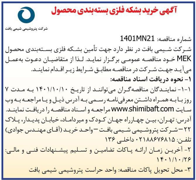 *شماره مناقصه: 1401MN21 شرکت پتروشیمی شیمی بافت در نظردارد جهت “تامین بشکه فلزی بسته بندی محصول MEK” مناقصه عمومی برگزار نماید. لذا از متقاضیان دعوت به عمل می آید جهت شرکت در مناقصه مطابق شرایط زیراقدام نمایند. ۱ -نحوه دریافت اسناد مناقصه : ١-١-نمایندگان مناقصه گران می توانند از تاریخ 1401/10/10 به مدت 7 روز…