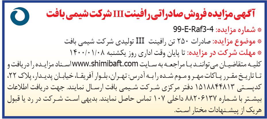 شماره مزایده: 99E-RAF3-4 موضوع مزایده: صادرات 250 تن رافینتIII تولیدی شرکت شیمی بافت مهلت شرکت در مزایده: تا پایان وقت اداری روز دوشنبه 1400/01/08 کلیه متقاضیان می توانند از لینکهای زیر اسناد مربوط به مزایده را دریافت و تا تاریخ مقرر پاکات مهر و موم شده به آدرس: تهران، بلوار آفریقا، خیابان پدیدار،پلاک22،کدپستی 1518844813 دفتر…