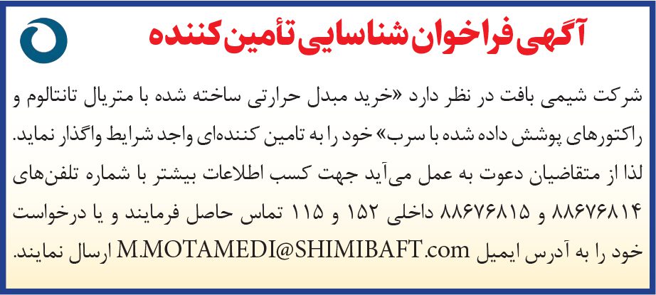 شرکت شیمی بافت در نظر دارد « خرید مبدل حرارتی ساخته شده با متریال تانتالوم و راکتورهای پوشش داده شده با سرب» خود را به تامین کننده ای واجد شرایط واگذار نماید. لذا از متقاضیان دعوت به عمل می آید جهت کسب اطلاعات بیشتر با شماره تلفن های 88676814 و 88676815 داخلی 152 و 115…