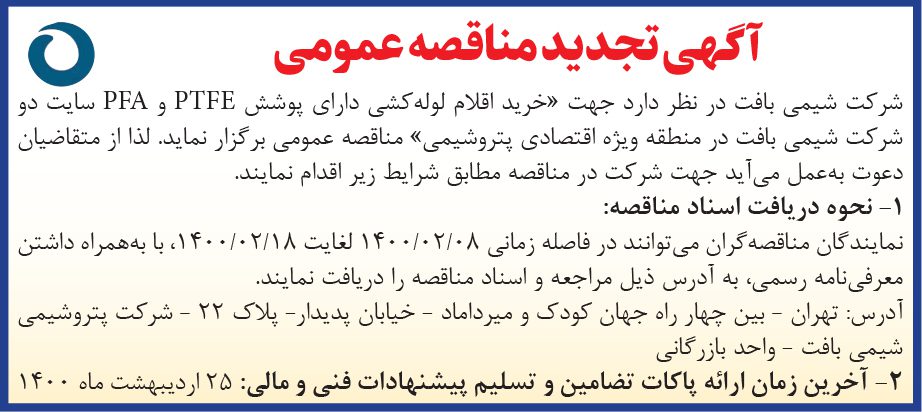 شرکت پتروشیمی شیمی بافت در نظر دارد جهت “خرید اقلام لوله کشی دارای پوشش PTFE و PFA سایت 2شرکت شیمی بافت در منطقه ویژه اقتصادی پتروشیمی” مناقصه عمومی برگزار نماید. لذا از متقاضیان دعوت به عمل می آید جهت شرکت در مناقصه مطابق شرایط زیر اقدام نمایند. 1-نحوه دریافت دستورالعمل شرکت در مناقصه: نمایندگان مناقصه…