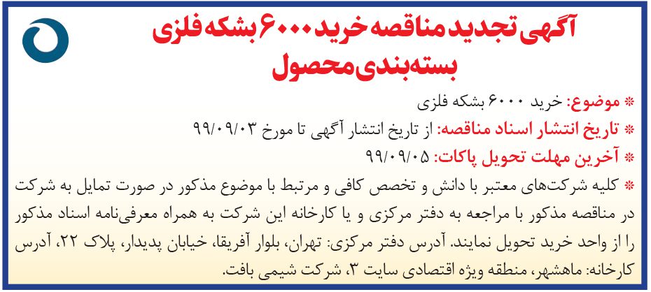 موضوع آگهی: مناقصه خرید 6000 بشکه فلزی بسته بندی محصول تاریخ انتشار اسناد مناقصه: از تاریخ چاپ آگهی تا مورخ 99/09/03 آخرین مهلت تحویل پاکات: 99/09/05 کلیه شرکت های معتبر با دانش و تخصص کافی و مرتبط با موضوع مذکور در صورت تمایل به شرکت در مناقصه مذکور با مراجعه به دفتر مرکزی یا کارخانه…