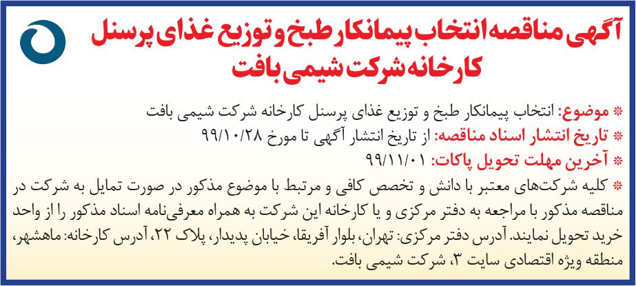 موضوع آگهی: شناسایی و انتخاب پیمانکار طبخ و توزیع غذای پرسنل کارخانه شرکت شیمی بافت تاریخ انتشار اسناد مناقصه: از تاریخ چاپ آگهی تا مورخ 99/10/02 آخرین مهلت تحویل پاکات: 99/10/09 کلیه شرکت ها و افراد معتبر با دانش و تخصص کافی و مرتبط با موضوع مذکور دعوت می گردد در صورت تمایل به شرکت…