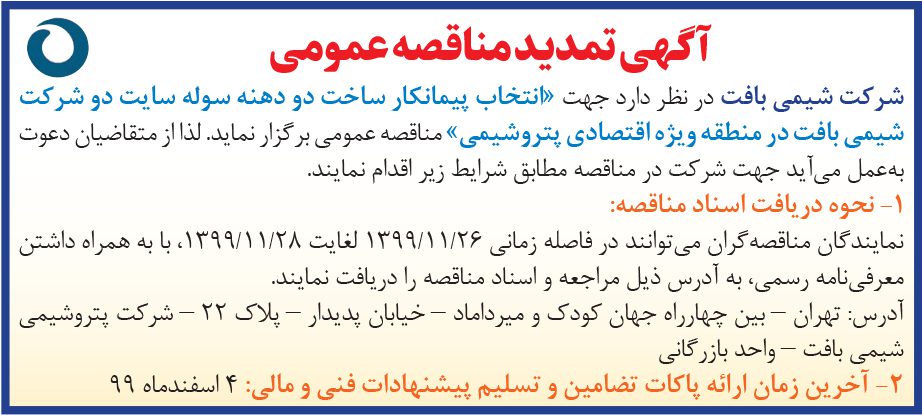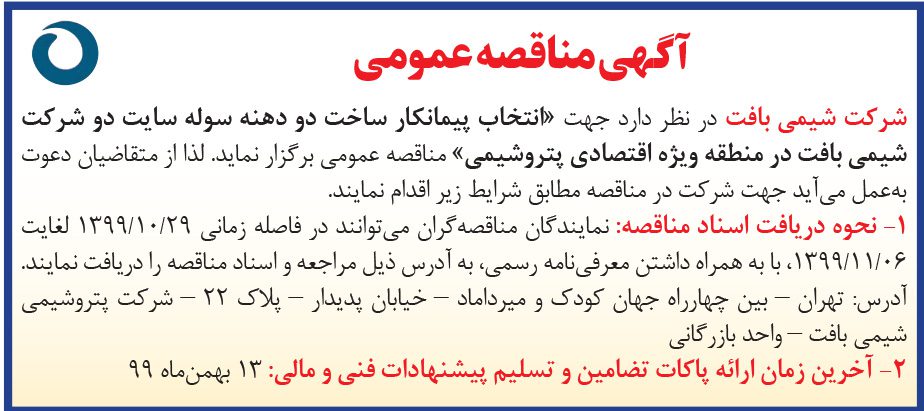 شرکت پتروشیمی شیمی بافت در نظر دارد جهت “انتخاب پیمانکار ساخت دو دهنه سوله سایت دو شرکت شیمی بافت در منطقه ویژه اقتصادی پتروشیمی” مناقصه عمومی برگزار نماید. لذا از متقاضیان دعوت به عمل می آید جهت شرکت در مناقصه مطابق شرایط زیر اقدام نمایند. نحوه دریافت دستورالعمل شرکت در مناقصه: نمایندگان مناقصه گران می…