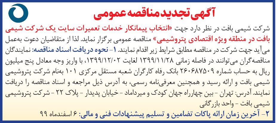 شرکت پتروشیمی شیمی بافت در نظر دارد جهت “انتخاب پیمانکار خدمات تعمیرات سایت یک شرکت شیمی بافت در منطقه ویژه اقتصادی پتروشیمی” مناقصه عمومی برگزار نماید. لذا از متقاضیان دعوت به عمل می آید جهت شرکت در مناقصه مطابق شرایط زیر اقدام نمایند. نحوه دریافت دستورالعمل شرکت در مناقصه: نمایندگان مناقصه گران می توانند در…