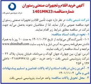 *شماره مناقصه: 1401MN23 شرکت پتروشیمی شیمی بافت در نظردارد جهت تأمین اقلام و تجهیزات صنعتی رستوران خود مناقصه عمومی برگزار نماید. لذا از متقاضیان جهت دریافت اسناد می توانند مطابق شرایط زیر اقدام نمایند. ۱ -نحوه دریافت اسناد مناقصه : ١-١-نمایندگان تأمین کنندگان می توانند از تاریخ 1401/10/27 بمدت ده روز با بهمراه داشتن معرفی…