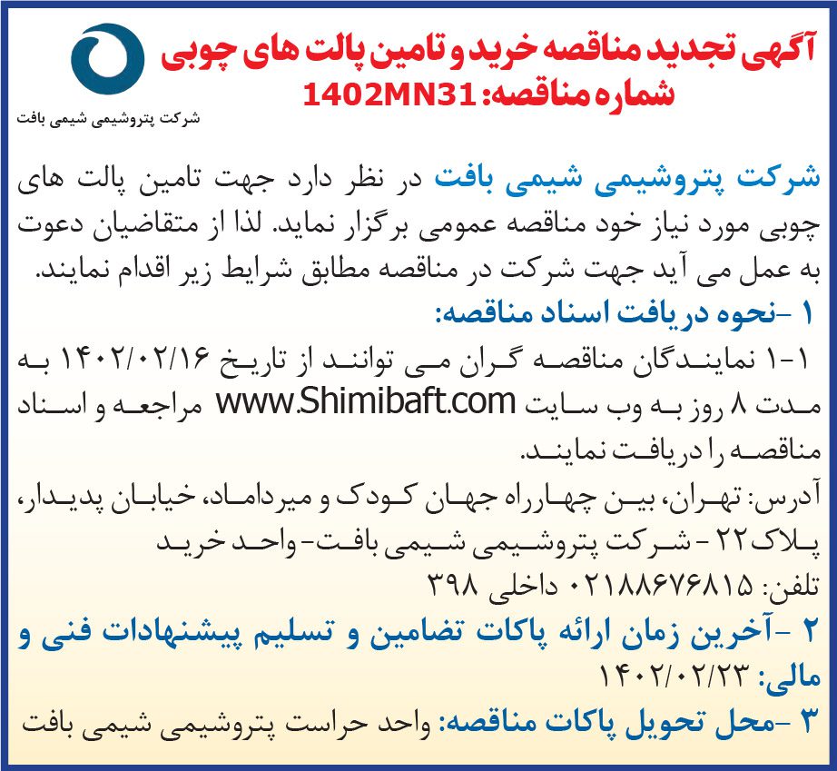شماره مناقصه: 1401MN31 شرکت پتروشیمی شیمی بافت در نظر دارد جهت تامین پالت های چوبی موردنیاز خود مناقصه عمومی برگزار نمايد. لذا از متقاضیان دعوت بعمل می آيد جهت شرکت در مناقصه مطابق شرايط زير اقدام نمايند. ۱ -نحوه دریافت اسناد مناقصه : ١-١-نمایندگان تأمین کنندگان می توانند از تاریخ 1402/02/16 بمدت 8 روز با…
