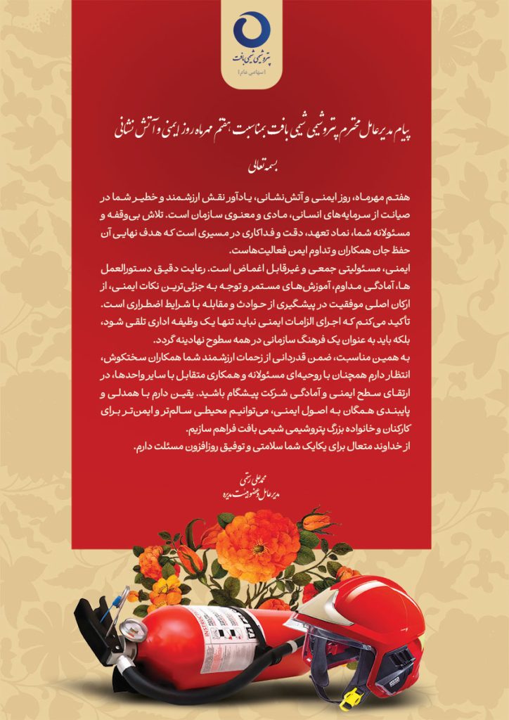 به همین مناسبت، ضمن قدردانی از زحمات ارزشمند شما همکاران سختکوش، انتظار دارم همچنان با روحیهای مسئولانه و همکاری متقابل با سایر واحدها، در ارتقای سطح ایمنی و آمادگی شرکت پیشگام باشید. یقین دارم با همدلی و پایبندی همگان به اصول ایمنی، میتوانیم محیطی سالمتر و ایمنتر برای کارکنان و خانواده بزرگ پتروشیمی شیمی بافت فراهم سازیم.