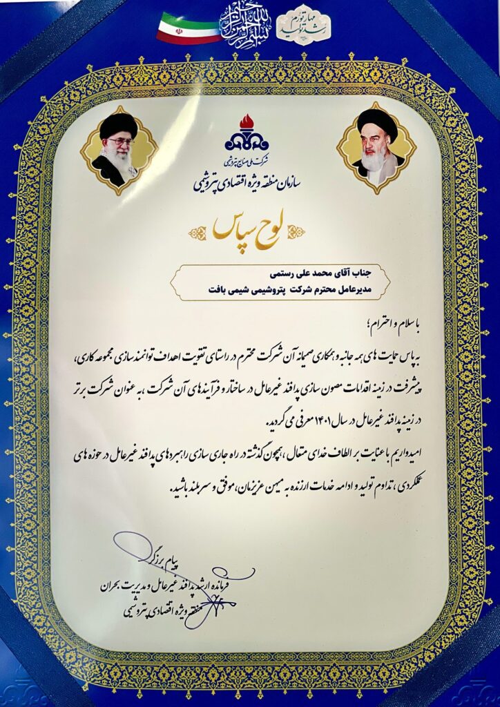 در آئین نکوداشت هفته پدافند غیرعامل در سازمان منطقه ویژه اقتصادی پتروشیمی از پتروشیمی شیمی بافت بعنوان شرکت برتر پدافندغیرعامل تقدیر شد.